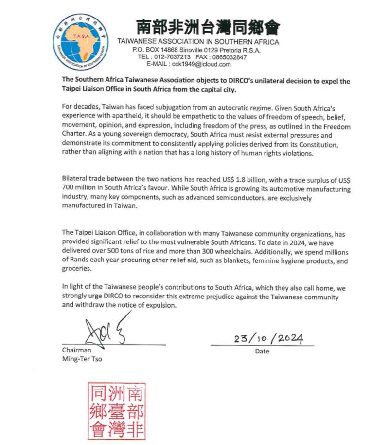 因此,「南部非洲台灣同鄉會」會長卓銘德和「非洲台灣商會聯合總會」會長陳智敏分別擬函,並透過李崇維以電郵方式,在23日發送到南非總統府、國會和當地媒體,表達台灣僑界對此事的深切擔憂和關注,並敦促南非政府能繼續堅守民主和自由意志價值的立場,撤回要求台灣代表處遷離首都和更名的決定。