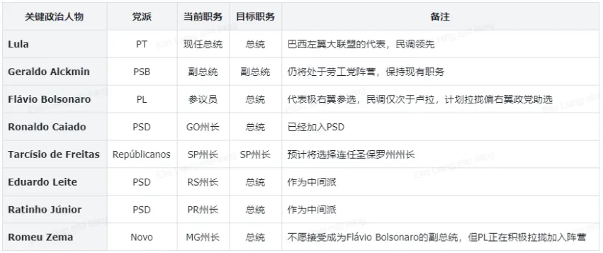 除了小博爾索納羅外,其他有潛力的中間和右翼候選人還包括南大河州州長Eduardo Leite(PSD)、帕拉那州州長Ratinho Júnior(PSD)、戈阿斯州州長Ronaldo Caiado(近期加入PSD黨)、米納吉拉斯州州長Romeu Zema(Novo),以及聖保羅州州長Tarcísio de Freitas(Repúblicanos)。然而,Tarcísio de Freitas很可能不會為了競選總統而放棄連任聖保羅州州長的機會,而其他右翼州長則不受此顧慮。