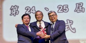 選務委員廖仁煌(中)監交、24屆會長鍾建仁(右)把印信交給25屆會長陳宗沐(左)